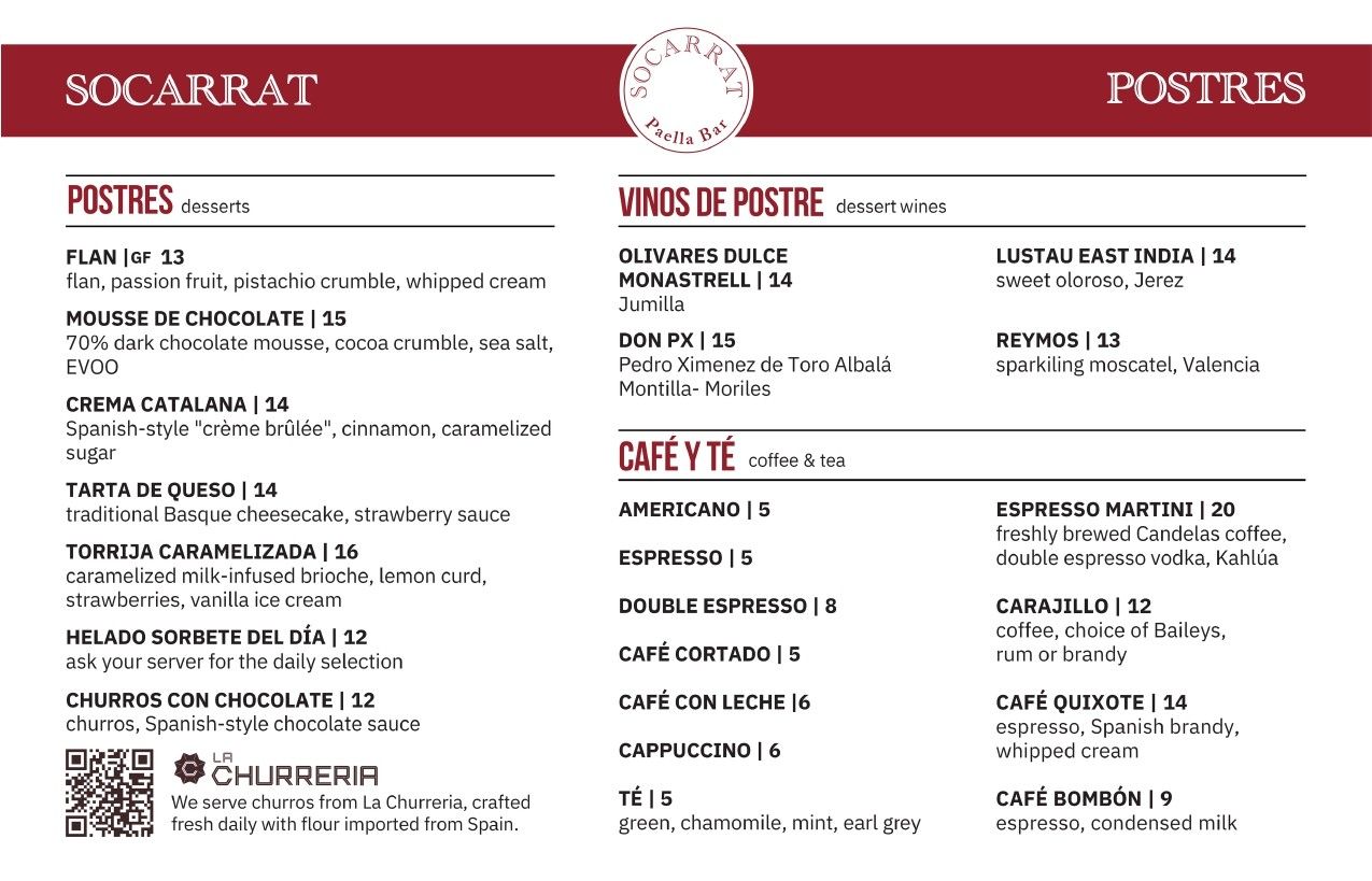 In Spain, dessert is never an afterthoughtâitâs a ritual, a reward, a reason to linger just a little longer. At Socarrat, we bring that spirit to every spoonful. Paired with a coffee cocktail or a glass of sherry, our desserts offer a final, irresistible taste of la buena vida.